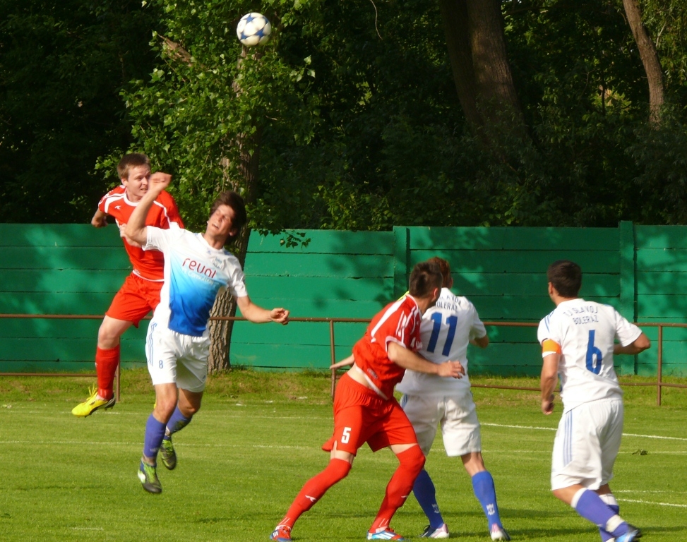 Tréner v tomto zápase zmenil rozostavenie a hralo sa na jedného hrotového útočníka. Na hre to zanechalo stopu oproti ostatným zápasom a nedostávali sme sa do šancí. Hneď na začiatku zápasu sa domáci Sládeček dostal do vyloženej šance, ale nechal len vyniknúť nášho brankára Sviteka. Hra sa potom viacmenej odvíjala v strede ihriska. V 33´minúte domáci hráč Bron druhýkrát fauloval, začo videl druhú žltú kartu a následne červenú. Zbytočne sa naši hráči zgrupli pri faule s hosťujúcimi, kde došlo k výmene názorov a strkaniciam. Do toho sa zapojil aj náš Adam Kitta s domácim hráčom. Na signalizáciu postranného rozhodcu sa musel pod sprchy porúčať aj on. Do konca polčasu zaujala už len strela Jaroslava Daniša spoza šestnástky, ktorú domáci brankár vyrazil na roh.
